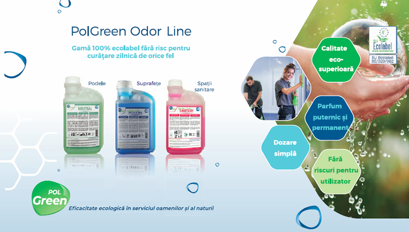 1) PolGreen Odor Line Indoors - dezvoltat special pentru curățarea unor suprafețe precum oglinzi, uși, pereți, birouri, pardoseli etc.